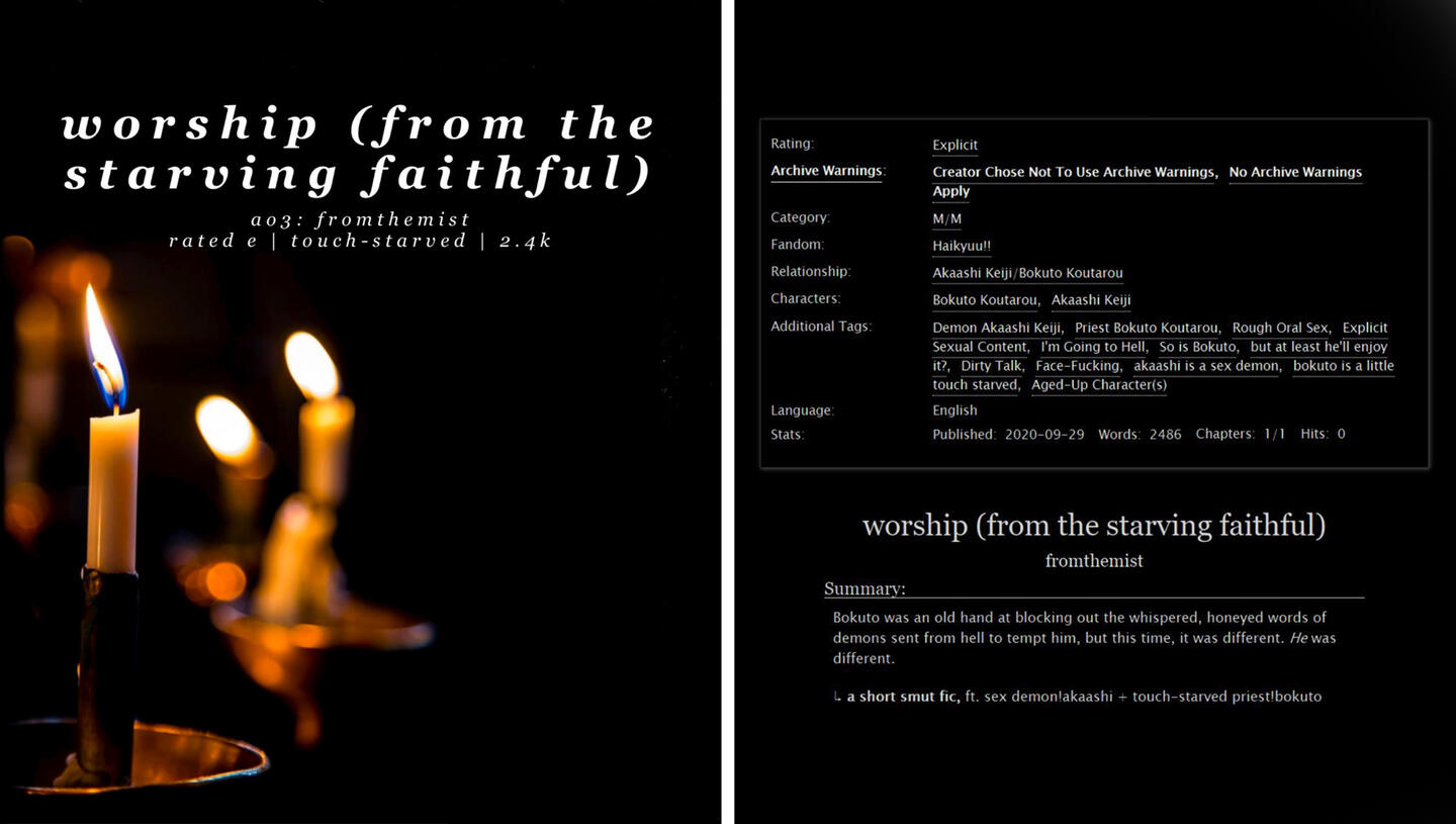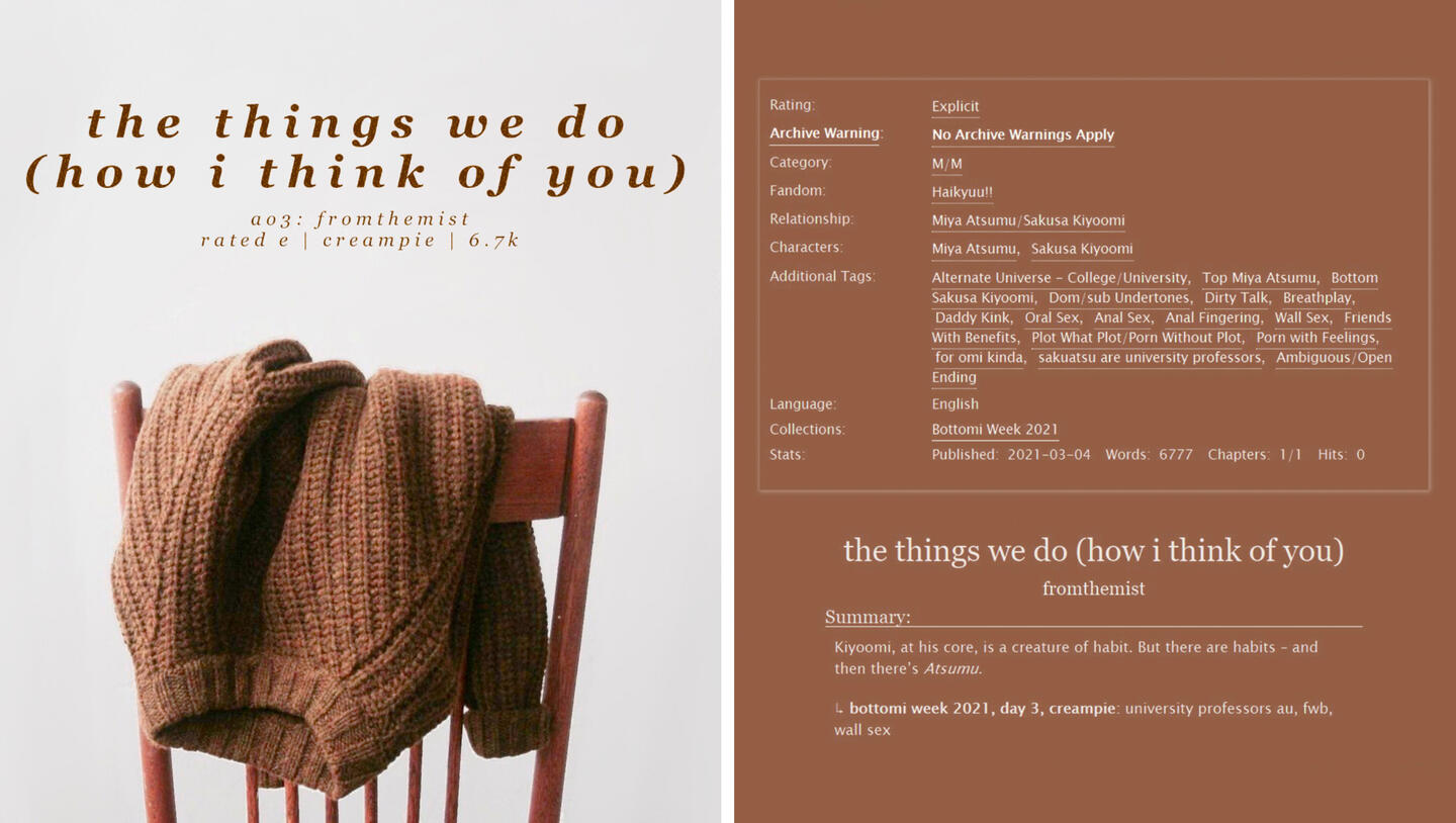 A collection of all the fics I've written, for both BNHA and HQ. Please heed the tags and warnings listed!↳ A full thread of my fics (SFW & NSFW) is here.